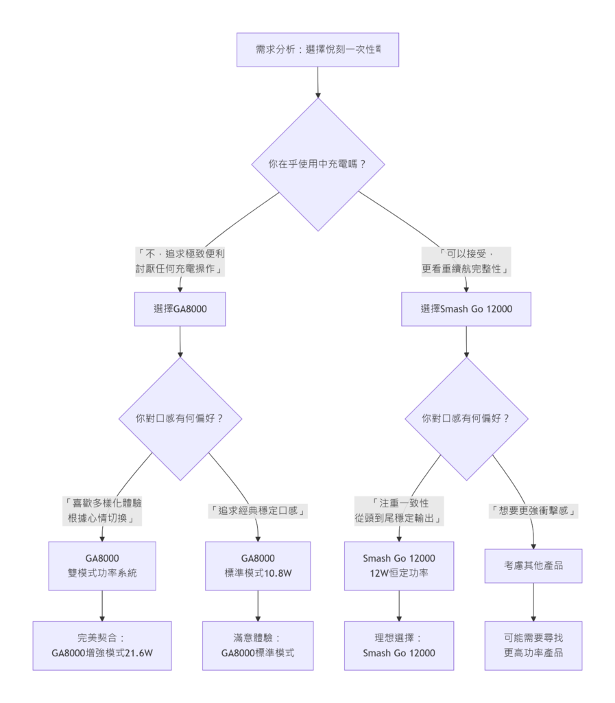 面對這兩款優秀產品,選擇的關鍵在於明確自身需求優先級。下面的流程圖可以幫助你做出決策:如果你經常出差或旅行Relx GA 8000 一次性電子煙的免充電特性可能更適合;如果你是辦公室或居家用戶Relx Smash Go 12000 拋棄式電子煙的可充電設計可能更為實用。